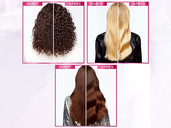 Résultats : les cheveux sont 2x plus brillants*, +88% de douceur* pour une transformation qui dure jusqu'à 10 shampooings**
